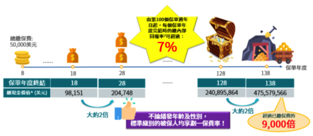 此选项被行使前,积存利率为非保证。一经行使,积存利率在第一期款项给付后便会锁定,直至身故保险赔偿已全数支付。