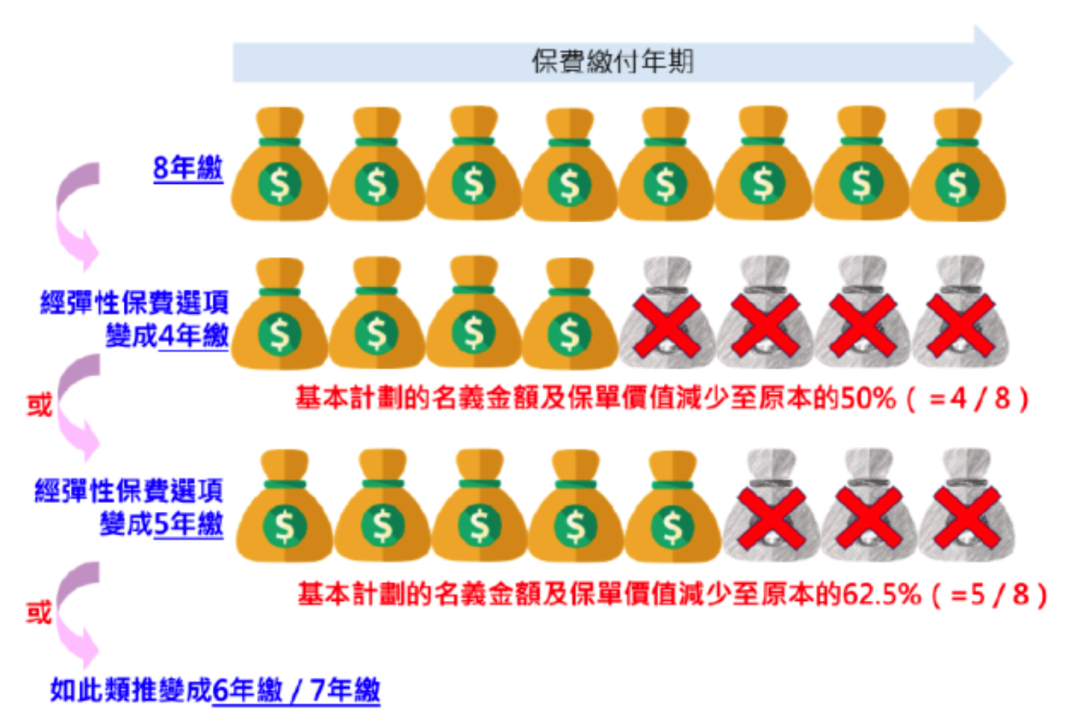 客户选择停缴后,保单名义金额只会按照已调整的保费缴付年期而相应地减少,不会有任何额外的损失。如图所示,如果客户第5年行使“弹性保费选项”,保费缴付期缩短到了4年,比起本来的8年减少了一半,应缴保费减少了50%,相应地,名义金额也会调整到原来的50%。其他年期可以此类推。