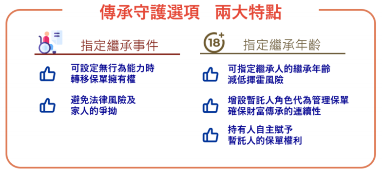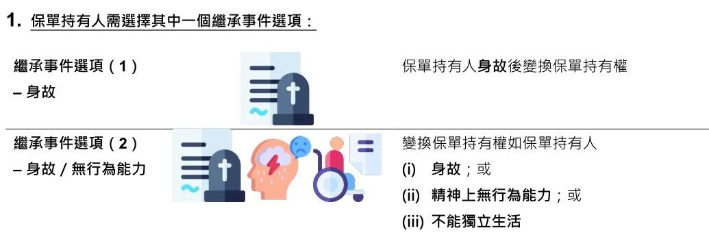 自由选择最适合的继承事件及继承时间,提早安排保单接管,全面掌控传承规划。