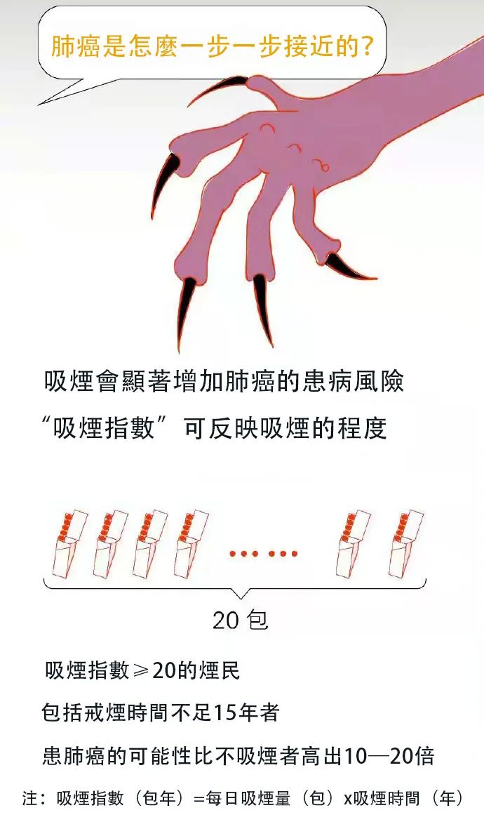 吸烟指数大于20包的烟民,包括戒烟时间不足15年的烟民,患肺癌的可能性比不吸烟的人高出10—20倍。