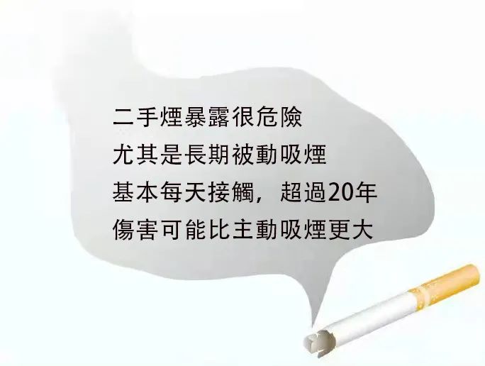 长期暴露在二手烟的环境中也很危险,尤其长期被动吸烟(基本每天接触,长达20年之久)