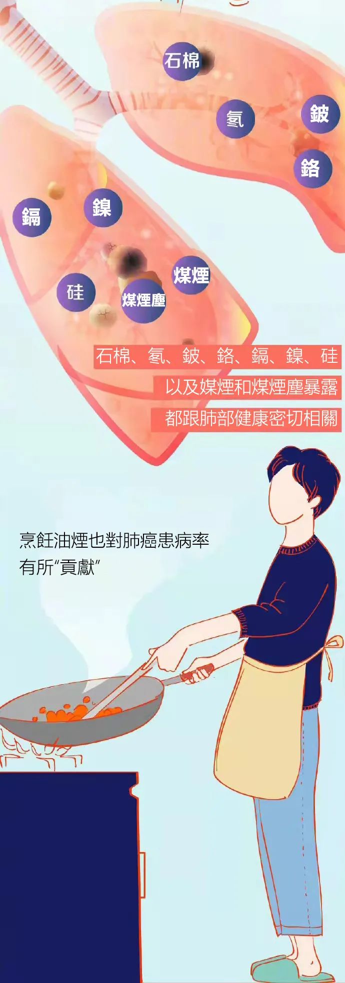 如果长期暴露在石棉、氡、铬、镉、镍、硅、铍以及煤烟和煤烟尘的工作环境中,那么就会增加患肺癌的机率。另外烹饪油烟、空气污染,尤其工业废弃也增加了患肺癌的机率。