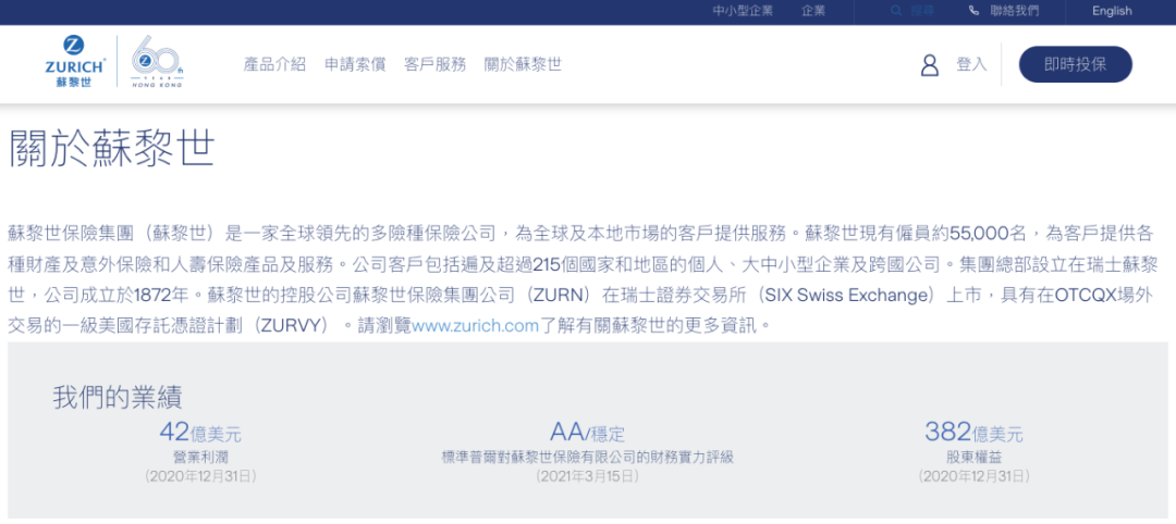 苏黎世保险(香港)1961年开业,提供一般保险和人寿保险服务,至今已经有61年。