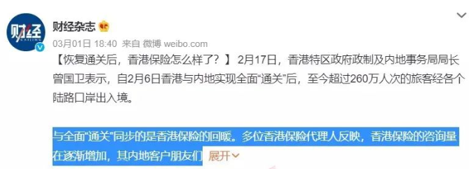3月1日,财经网发表题为《恢复通关,香港保险怎么样了》,与全面“通关”同步的是香港保险的回暖。