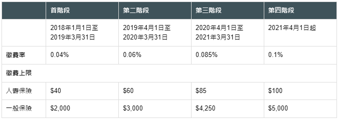 自 2018 年 1 月 1 日起,保险业监管局(保监局)将依法例 1 向投保人收取保费征费,初期的征费率为每保单年度保费的 0.04%,并会逐步调整至 0.1%。每张保单需要缴纳的征费设有上限。