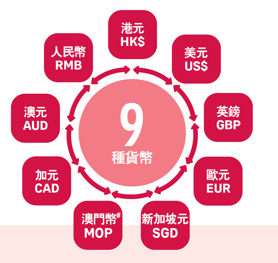 美元、人民币、英镑、欧元、新加坡元、澳元、加元、港币、澳门币共9种货币自由转换,支持全球多元布局。