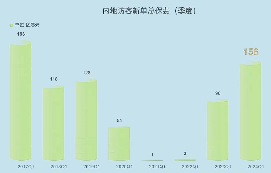 年首个季度,内地访客在香港投保的总金额达到了156亿港元,相较于2023年同期的96亿港元,实现了显著增长!