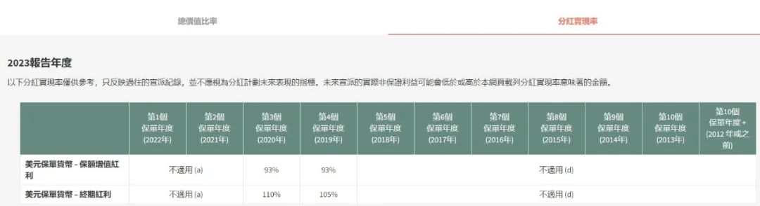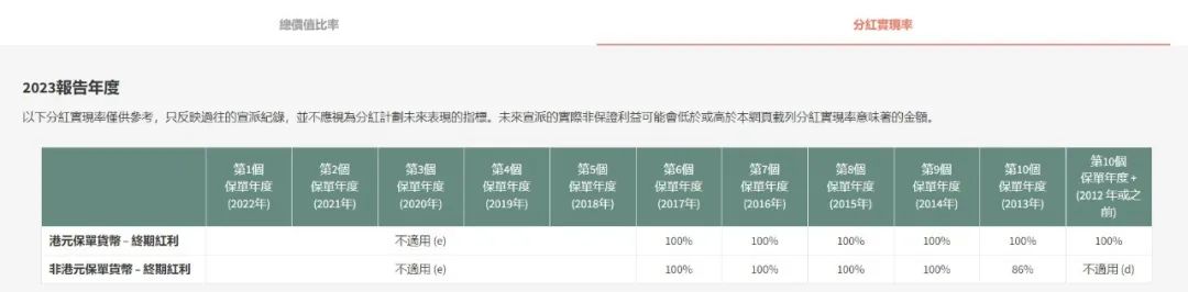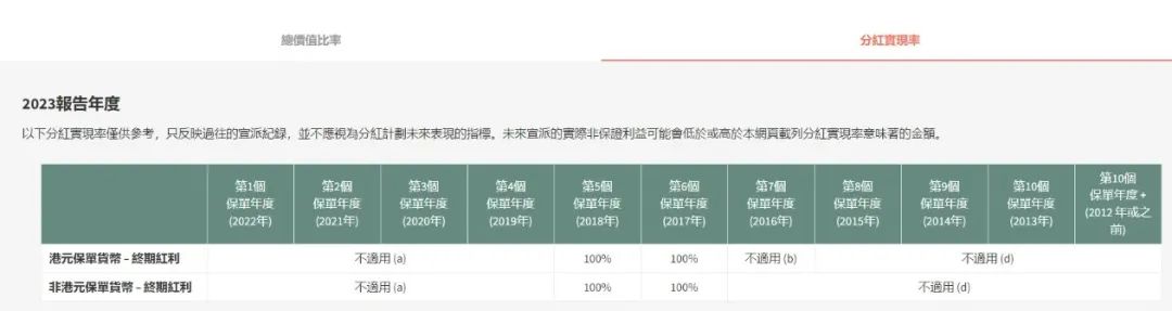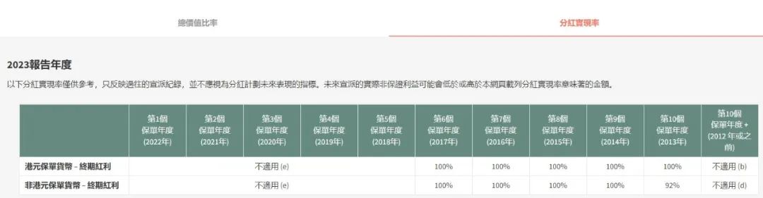 年终期红利为92%、100%、100%、100%、100%;