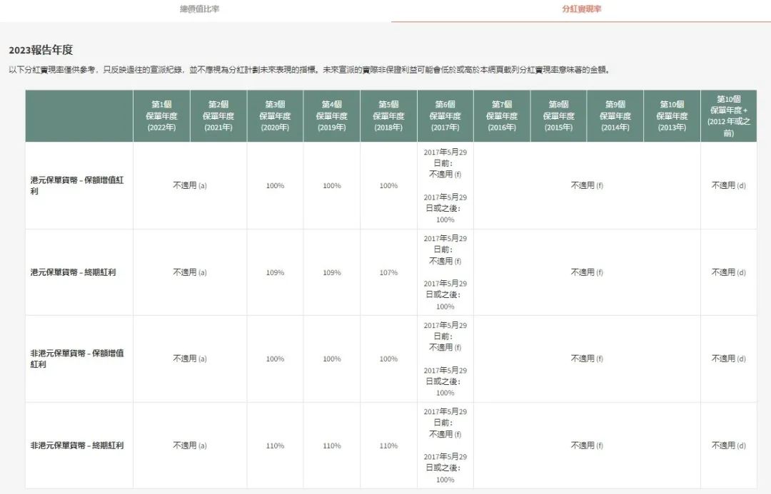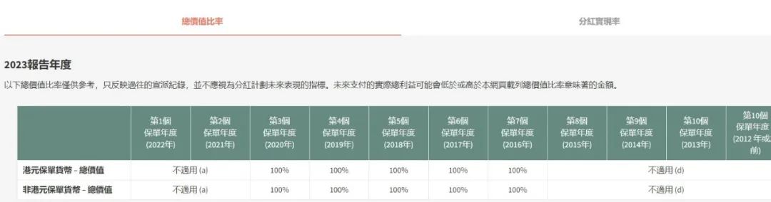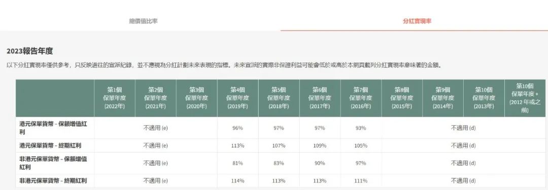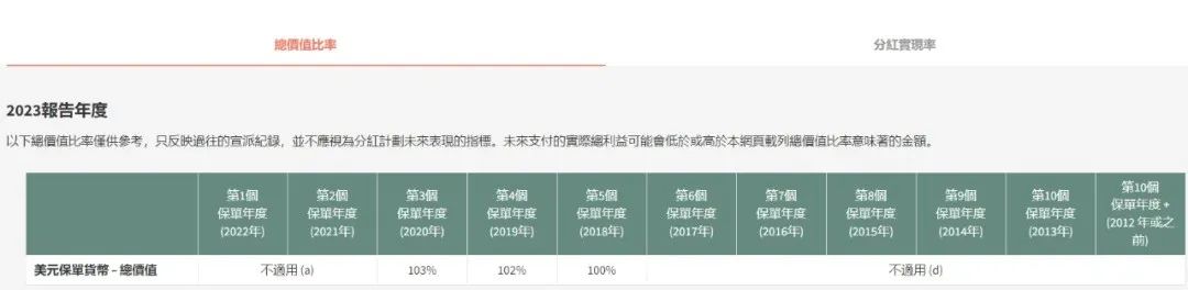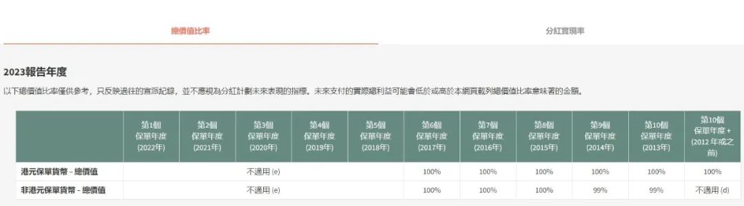 2017~2019年投保,2023年港元保单货币的总价值比率为102%~105%,非港元保单货币的总价值比率为100%~104%。