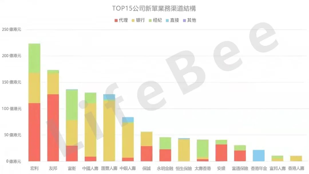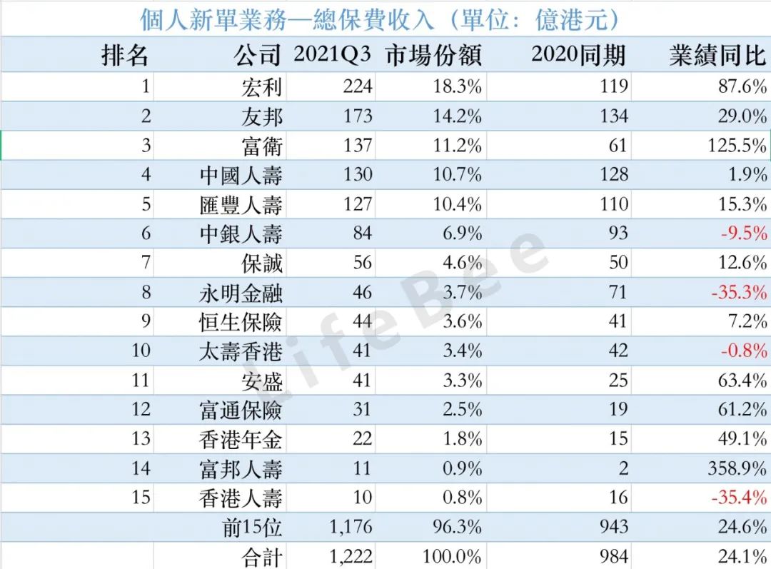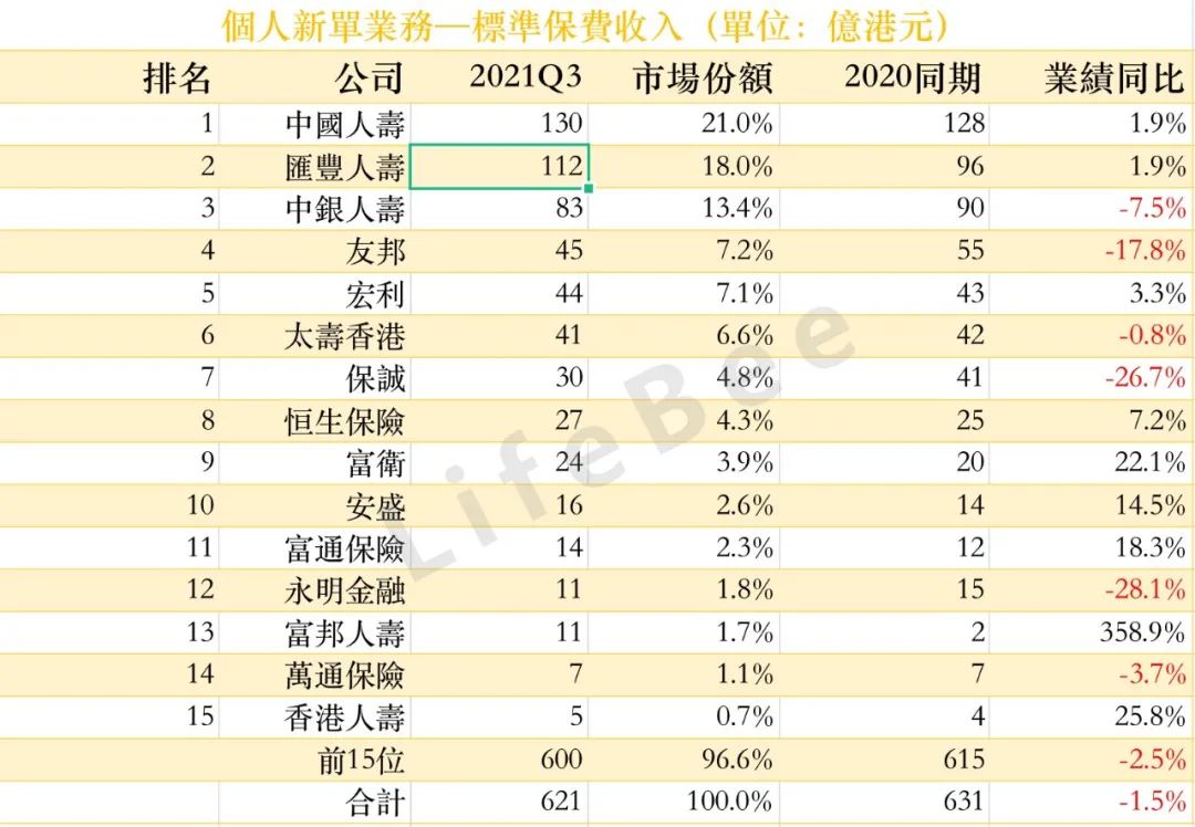 新单业务排名前15名的香港保险公司市场占比为96.3%。排名