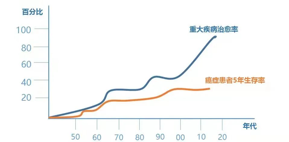 。如下图所示,重大疾病治愈率和癌症患者5年生存率,近年来都呈现大幅升高的趋势。例如:近50年大肠癌患者的5年平均存活率上升了3.5备。
