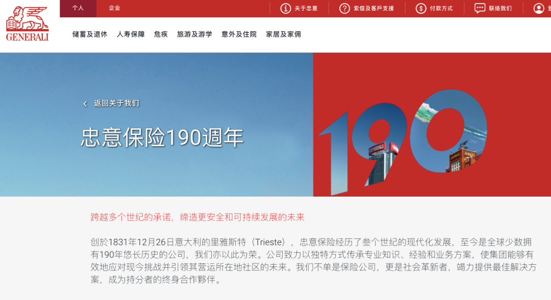 意大利忠意保险(Assicurazioni Generali)1831年创立于裡雅斯特(Trieste),经历了三个世纪,拥有191年历史。忠意在全球50个国家开展业务,在欧洲处于领先地位。