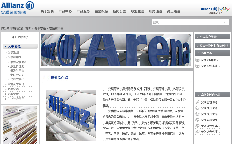 德国安联保险集团(英语:Allianz SE)成立于1892年,总部位于德国慕尼,是全球最大的金融服务集团之一,也是德国最大的保险公司。安联保险集团的业务广泛分布于全球77个国家和地区,提供包括寿险和健康险、财产险和责任险,再保险领域中所有险种以及风险管理咨询服务,并在全球范围内为机构和个人投资者提供资产管理服务。