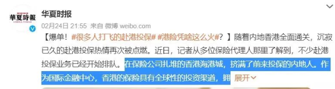 2月24日,华夏日报发表题为《爆单!很多人打“飞的”赴港投保,港险凭啥这么火?》,发出内地媒体感叹香港保险如此火爆的灵魂拷问。