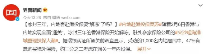 3月2日,界面新闻发表题为《冰封三年,内地客赴港投保要“解冻”了吗?》,表示香港与内地实现全面“通关”,冰封三年的香港保险开始解冻,驻扎多家保险公司的尖沙咀海港城重现投保人潮。