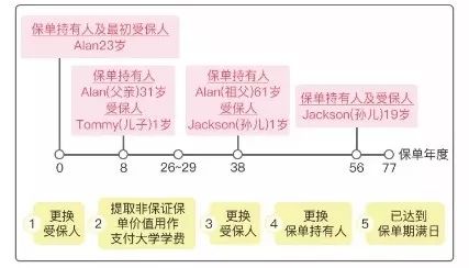 目前不少香港储蓄险保单都可以实现“无限次更改受保人”功能,实现富传三代功能,如图所示:
