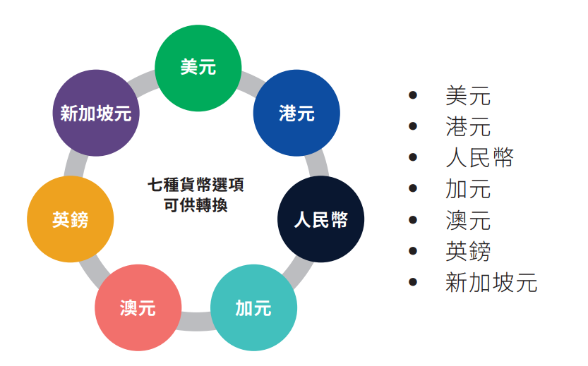 比如以美元、港元为主的保单货币,同时可有人民币、英镑澳元、加元、新加坡元、澳门元选择,最高9种货币的选择。可以根据自己的需求来选择不同币种。