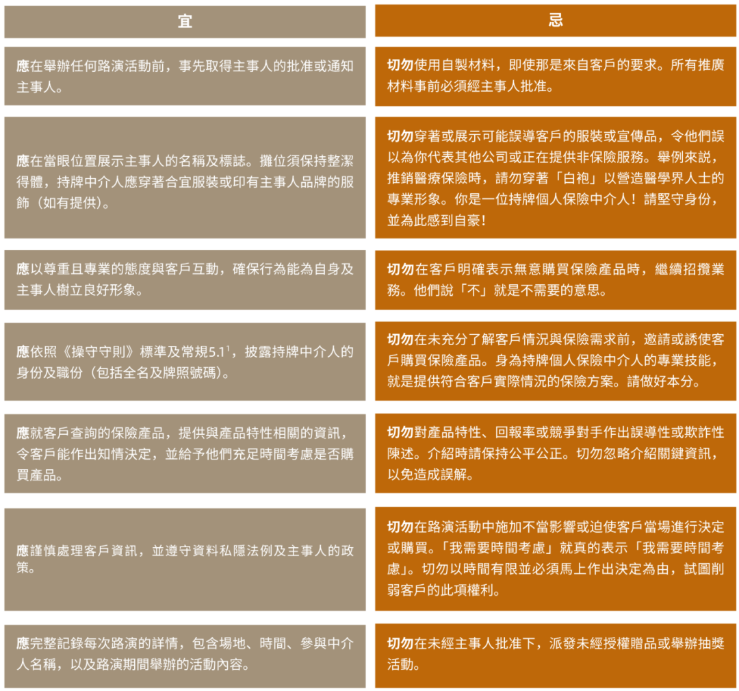 ①透明识别:清晰展示保险公司(主办方)名称和标志,中介人必须向客户披露全名及牌照号码。②遵守法规:必须严格遵循保监局的一系列指引,包括但不限于:GL25(提供礼品)、GL26(投资相连寿险计划)、GL27(保单更换)、GL29(冷静期)、GL30(财务需要分析)等。③专业诚信:保持诚实、正直。禁止误导、夸大、隐瞒重要资讯,或推广跨行业服务(如移民、投资)来吸引客户。④清晰沟通:所有资讯(口头、书面)必须准确、易懂。所有宣传材料必须经过公司事先审批。⑤尊重客户:给予客户充足时间和空间做决定,禁止使用高压或滋扰性销售手法。⑥资料保护:严格遵守《个人资料(私隐)条例》,仅在有必要并获客户同意下收集资料,并确保实体和电子资料的安全储存。