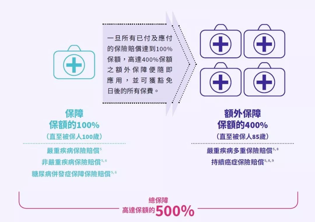 「爱护同行」提供总保障高达保额的500%(多重赔付保障至被保人85岁)