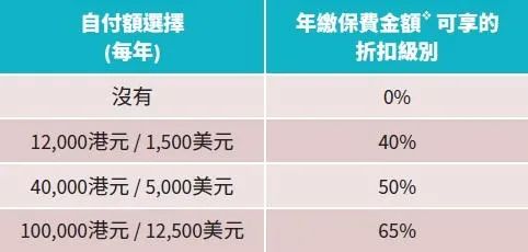视乎所选的自付额选择,您的年缴保费v 可享折扣优惠。您同意分担的医疗费用部分及相应可享的折扣优惠详列如下: